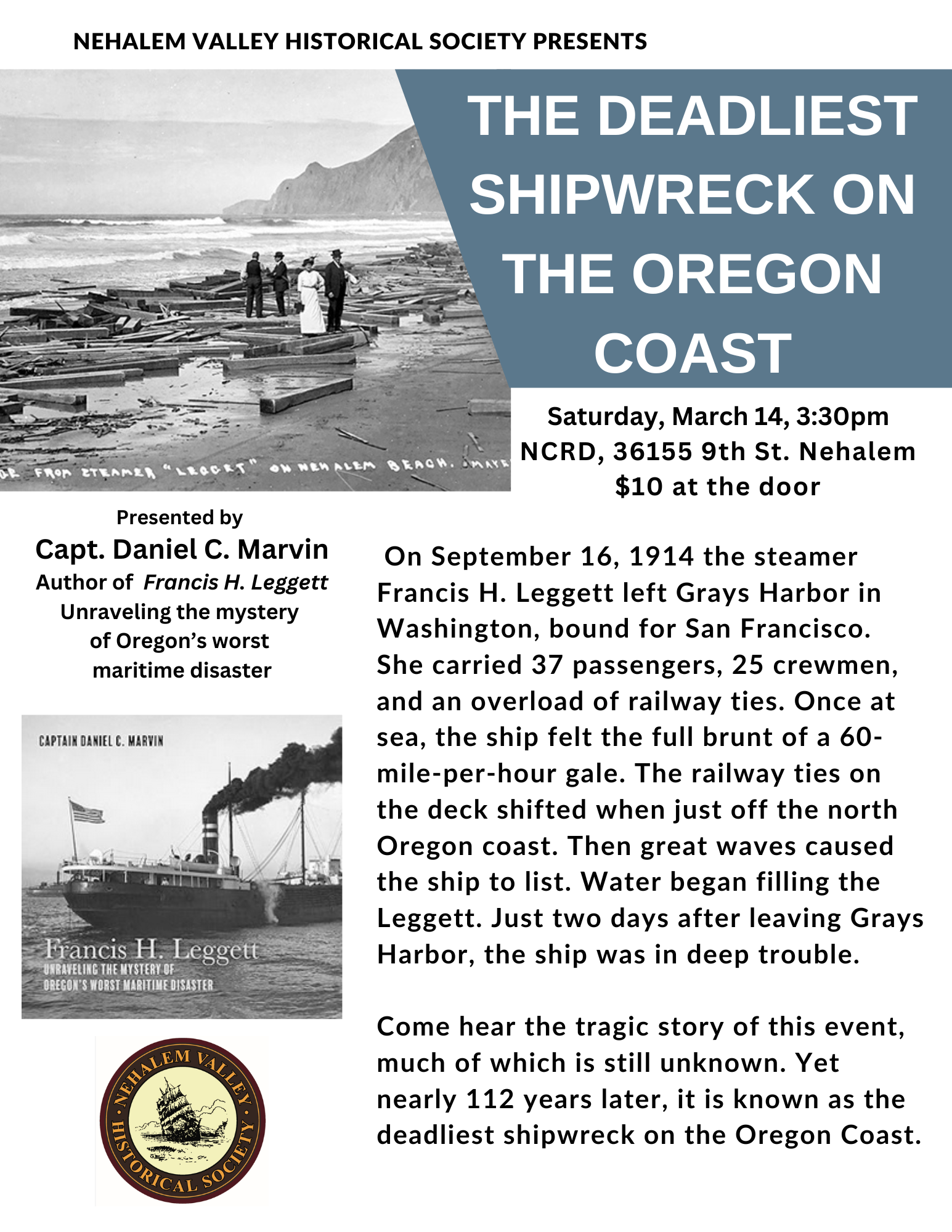 *Tickets can be purchased at the door* On September 16, 1914 the steamer Francis H. Leggett left Grays Harbor in Washington, bound for San Francisco. She carried 37 passengers, 25 Crewmen, and an overload of railway ties. Once at sea, the ship felt the full brunt of a 60-mile-per-hour gale. The railway ties on the deck shifted when just off the north Oregon coast. Then great waves caused the ship to list. Water began filling the Leggett. Just two days after leaving Grays Harbor, the ship was in deep trouble. Come hear the tragic story of this event, much of which is still unknown nearly 112 years later, it is known as the deadliest shipwreck on the Oregon coast.
