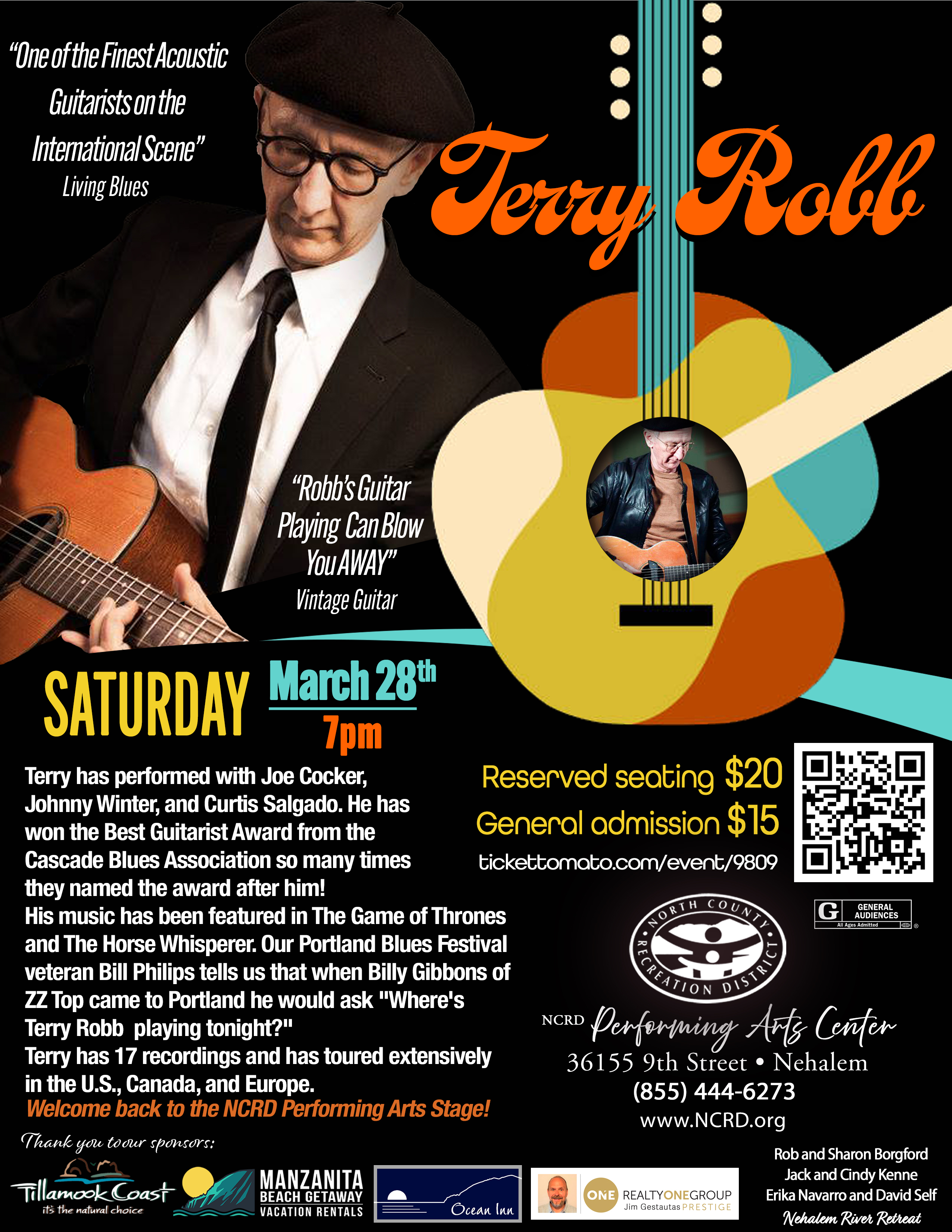 Terry has performed with Joe Cocker, Johnny Winter, and Curtis Salgado. He has won the Best Guitarist Award from the Cascade Blues Association so many times they named the award after him! His music has been featured in The Game of Thrones and The Horse Whisperer. Our Portland Blues Festival veteran, Bill Philips, tells us that when Billy Gibbons of ZZ Top came to Portland, he would ask, "Where's Terry Robb playing tonight?" Terry has 17 recordings, and he has toured extensively in the U.S., Canada, and Europe.